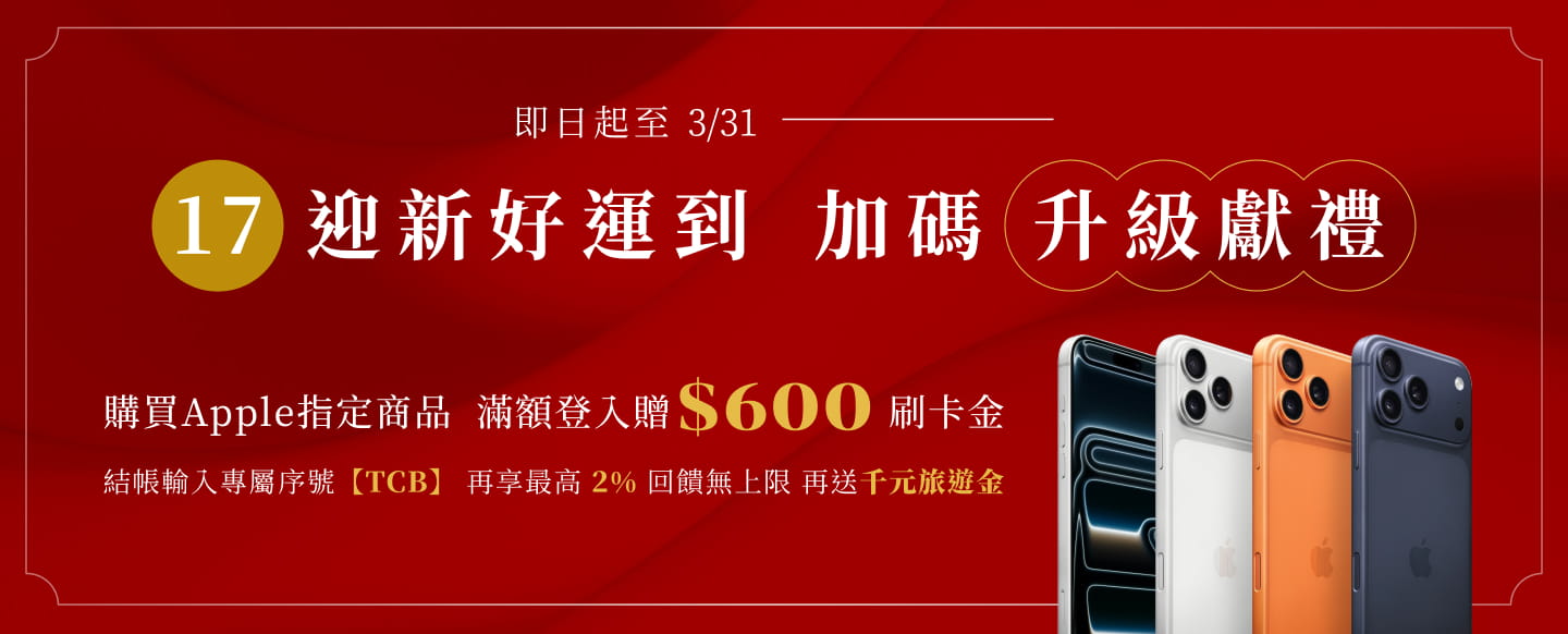 購買Apple指定商品送千元旅遊金,輸入專屬序號【TCB】享最高2%回饋無上限,再享分期 0 利率